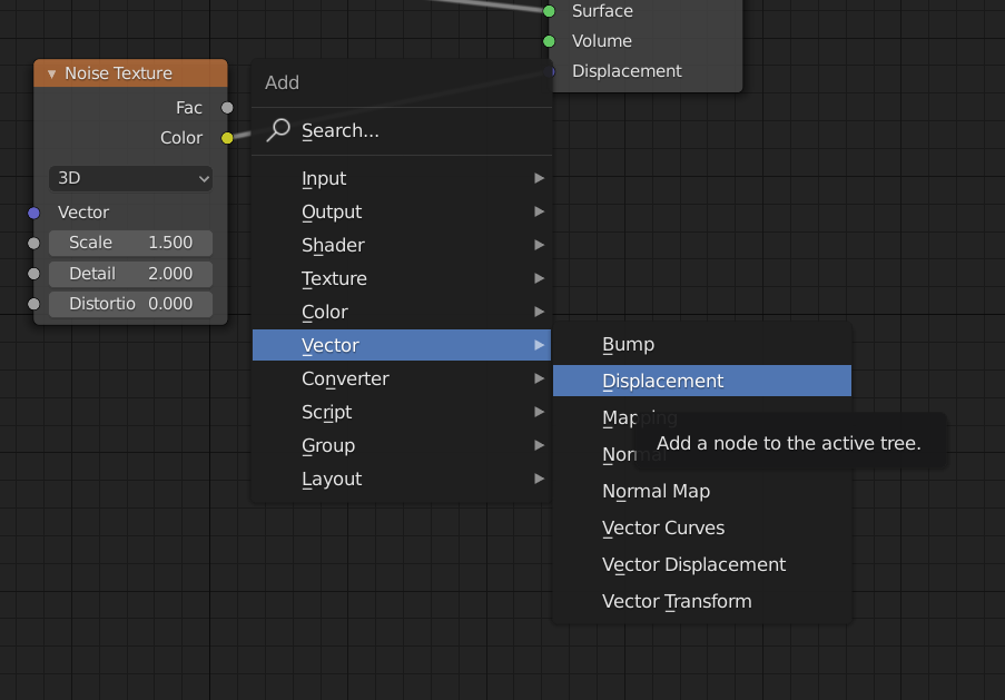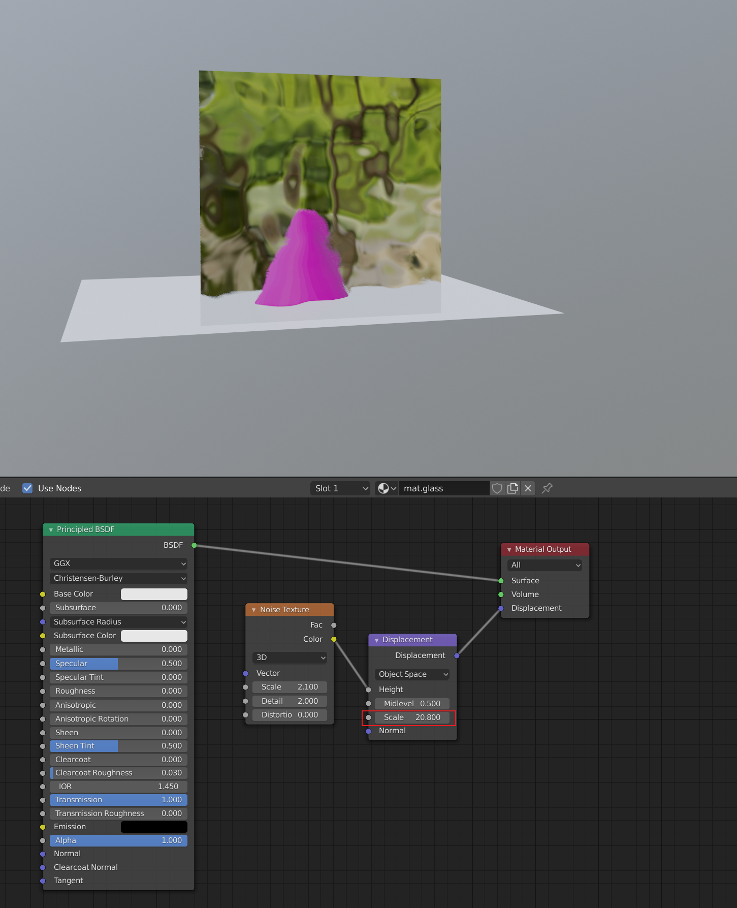 3. Noise Texture의 Color값을 Material Output의 Displacement 에 연결. Scale 값을 조정한다.